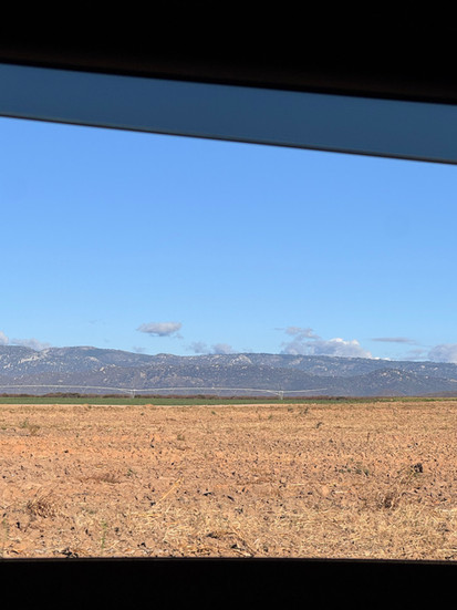 1) An irrigation dam being constructed at the farm 2) The area where the cows file in to get milked twice daily 3) View from the farm headquarters, overlooking the mountains 4) View of the corn fields that are grown as feed for the cows 5) Lucy and the horses of the second farm 6) Jersey cows at the second farm 7) Views from the paddock with the Arabian horses